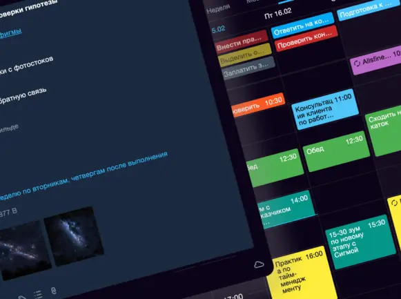 Визуальное планирование времени с возможностью видеть всю картину дня, недели и месяца.