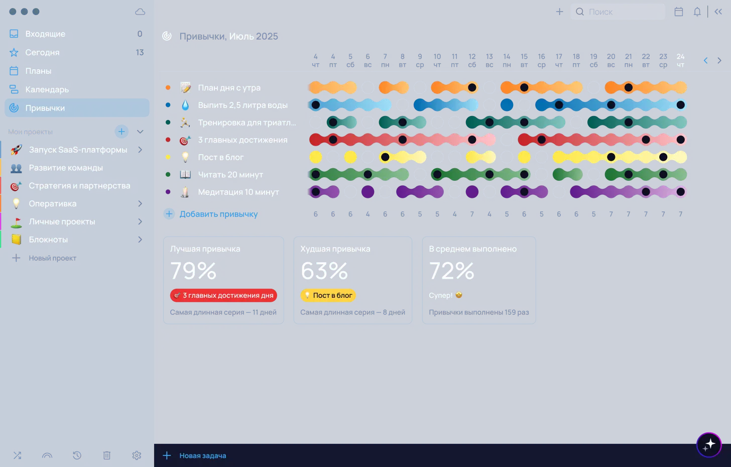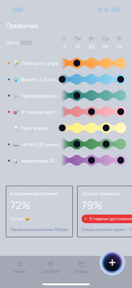 Формируйте полезные привычки каждый день. Наглядный прогресс поможет отслеживать результат и ваши успехи.