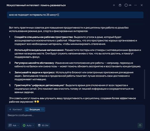 На это умный помощник может порекомендовать, к примеру, метод Помодоро, наушники с шумоподавлением или регулярные «встречи с самим собой» для оценки прогресса.
