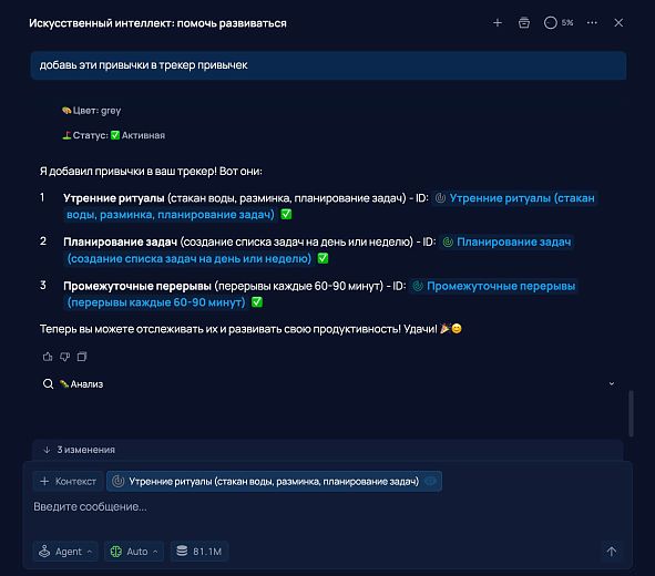Переключаем ИИ с режима Ask на Agent и просим добавить три привычки в трекер привычек SingularityApp. И да, новый чат открывать не придется: умный помощник помнит контекст разговора и поймет, о чем речь.