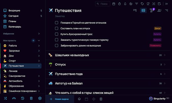 Как в планировщике: в Сингулярити ваше «Оглавление» — оно слева в виде проектов, которые всегда перед глазами. Проекты вы можете добавлять по мере их появления, не торопитесь охватить сразу всё наперёд. Начните с общих разделов, например: «работа», «хобби», «покупки», «саморазвитие».