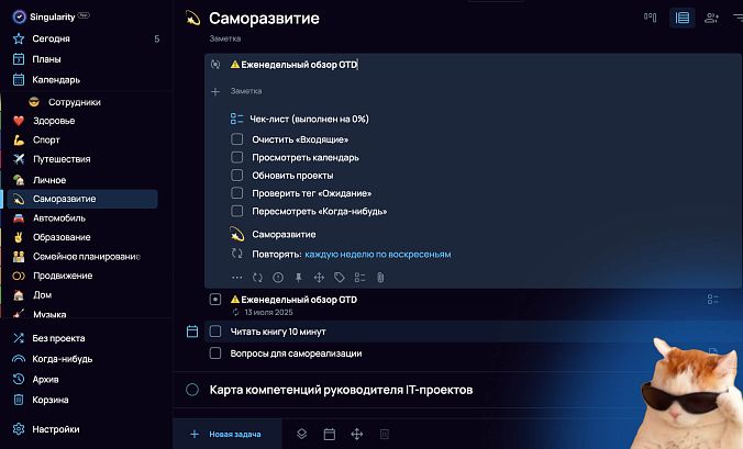 К слову, в SingularityApp есть специальный режим проверки. Он автоматически подсвечивает проекты, которые давно не пересматривались. Настраиваете интервалы (например, раз в неделю для активных проектов, раз в месяц для долгосрочных) и добавляете в планировщик повторяющуюся задачу «Еженедельный обзор». В нужное время система напомнит, что требует внимания.
