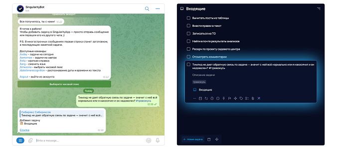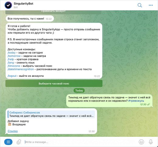 Для быстрой фиксации триггеров можно использовать Telegram-бот планировщика SingularityApp. Отправьте боту сообщение с описанием ситуации и тегом #тревожусь, и он автоматически создаст аналогичную запись в приложении. Позже, при анализе паттернов, вы легко сможете найти все «тревожные» записи по тегу.