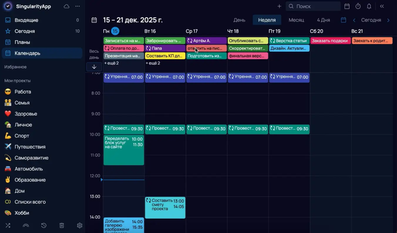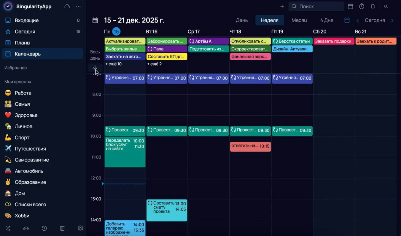 Как использовать: в режиме недели разворачиваете блок, раскидываете задачи по дням, перетаскиваете в расписание и растягиваете по времени. Закончили планировать — сворачиваете блок одним кликом, и вся временная сетка снова перед глазами.