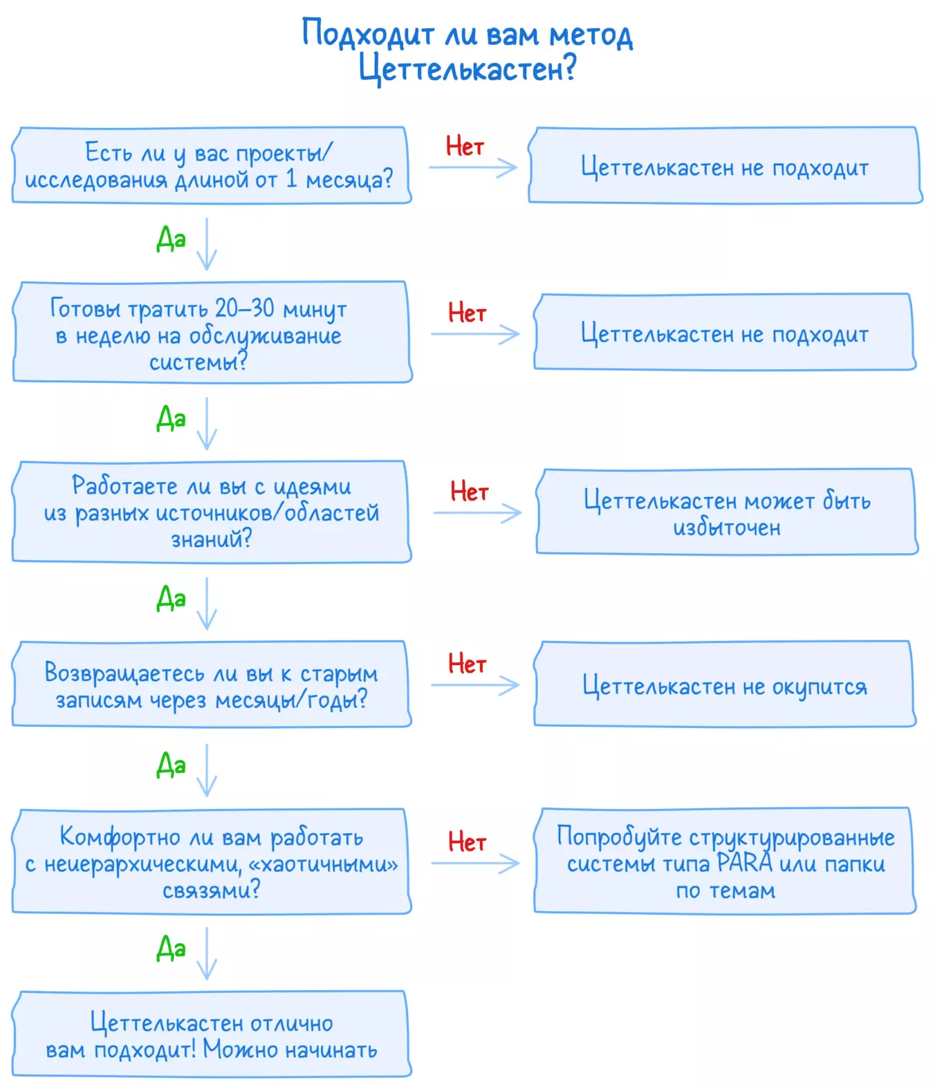 Ведение «картотеки Лумана» требует определенного склада мышления. Если вы предпочитаете строгие иерархические структуры и четкие категории, неупорядоченная (на первый взгляд) сеть идей Zettelkasten может вызывать больше тревоги, чем вдохновения.