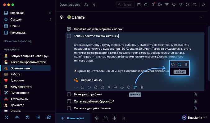 Как сделать чек-лист: Сингулярити не просто приложение для создания чек-листов, это полноценный таск-менеджер. Решение для тех, кто не любит плодить сущности и предпочитает держать все задачи, проекты и списки в одной системе.