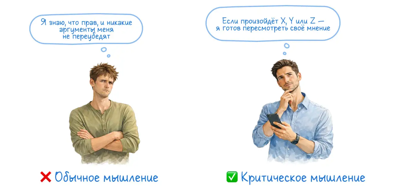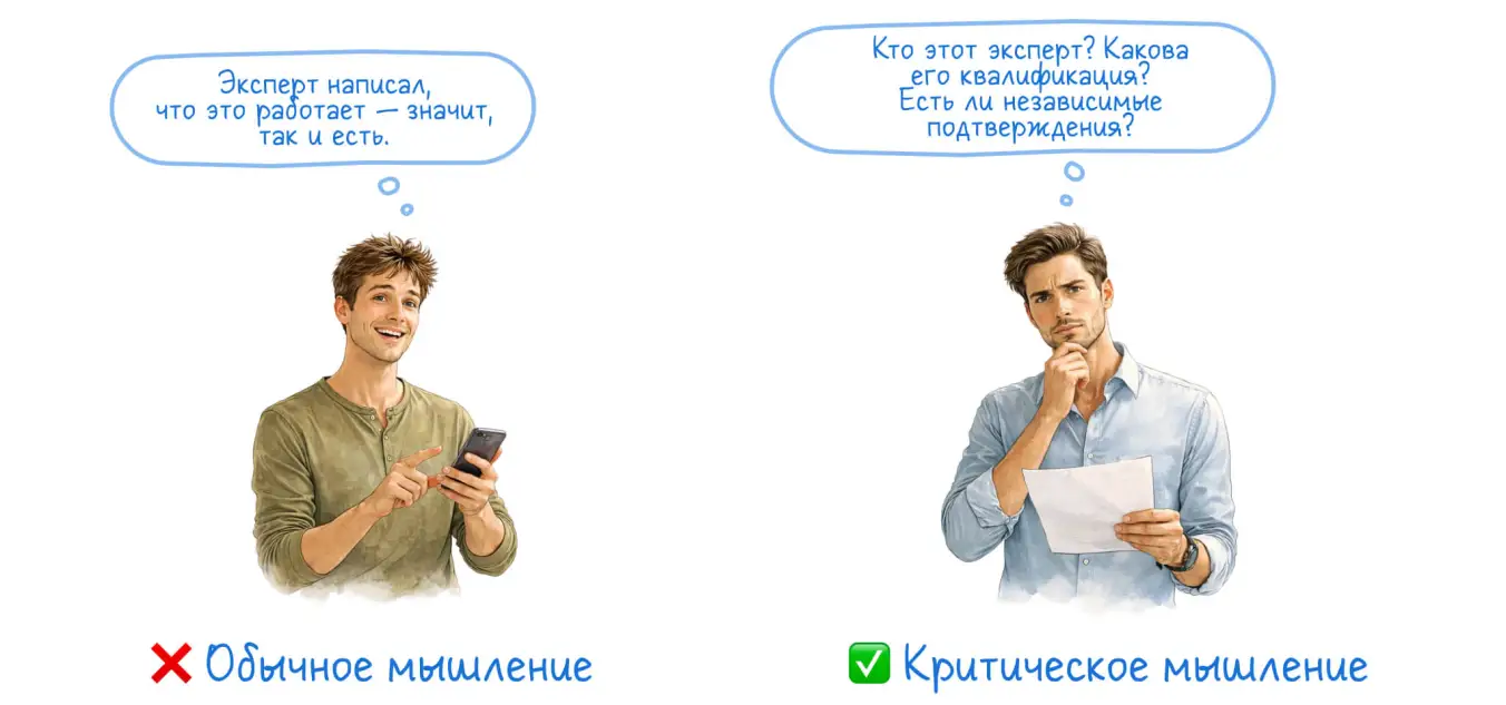 Критическое мышление защищает нас от дорогостоящих ошибок в самых разных областях. Оно спасает кошелек от финансовых пирамид и импульсивных покупок, здоровье — от шарлатанов, а разум — от дезинформации и ложных убеждений.