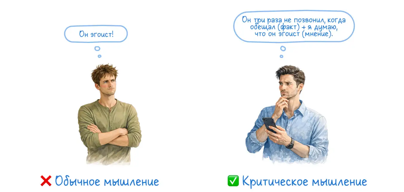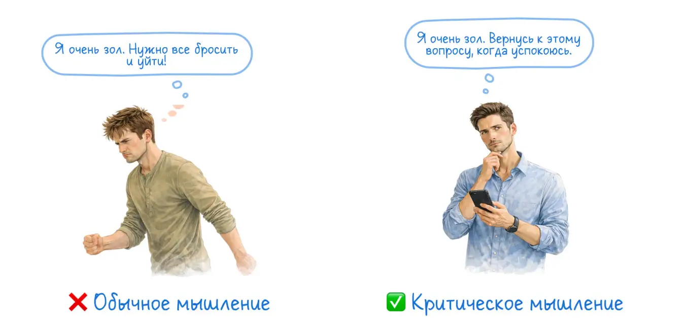 Чтобы научиться критическому мышлению, важно уметь отделять эмоции от рациональных суждений. Эмоции часто подталкивают нас к ошибочным решениям, создавая иллюзию срочности и правильности действий «прямо сейчас». Обиделись на начальника? Хочется тут же положить ему на стол заявление. Друзья восторгаются новым гаджетом? Хочется сразу же опустошить банковскую карту.