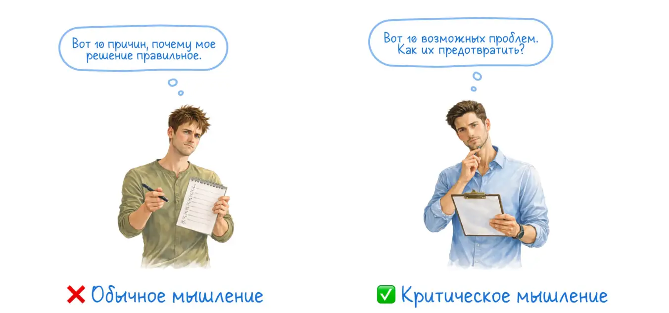 Практика поиска проблем и ошибок — это отличный способ прокачать критическое мышление, сознательно переключая свой мозг «с позитива на негатив».