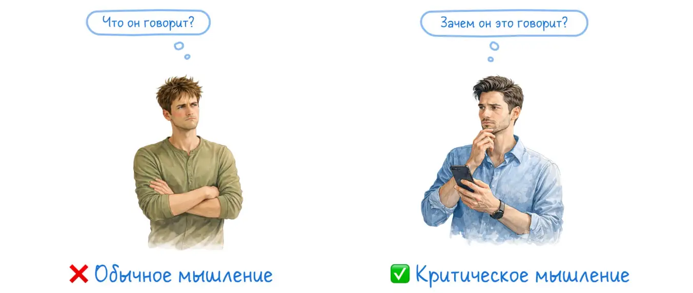 Методов манипуляции существуют сотни, и вы физически не можете распознать их все. Чтобы вычислить конкретную ложь, зачастую нужны исследования и долгий фактчекинг. Но если вы понимаете мотивы источника, вы уже наготове: вы знаете, в какую сторону может быть искажена информация. Привычка анализировать чужие цели помогает развивать критическое мышление и эффективно фильтровать информацию.