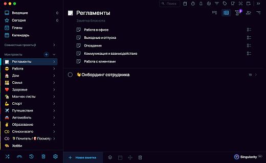 Например, в приложении-планировщике SingularityApp можно создать отдельный проект для регламентов и создавать там задачи с заметками, прикрепляя файлы и изображения. Проектом легко поделиться по ссылке.