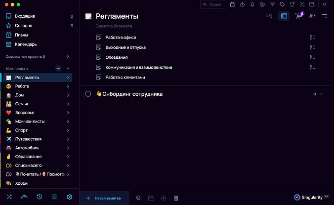 - В приложении-планировщике SingularityApp можно создать отдельный проект для регламентов и создавать там задачи с заметками, прикрепляя файлы и изображения