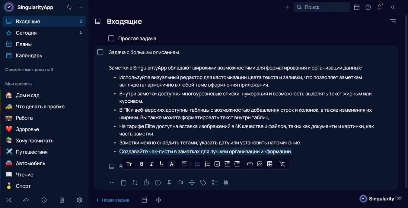 Описание размещается прямо под задачей, ограничений по символам нет. Если выделить любой символ во введённом тексте, появляется интерфейс визуального редактора заметки. Он позволяет добавлять ссылки, форматировать заголовки и списки. Кроме того, в редакторе можно выделять текст, вставлять изображения, создавать подзадачи и чек-листы, оформлять инструкции и структурированные записи.