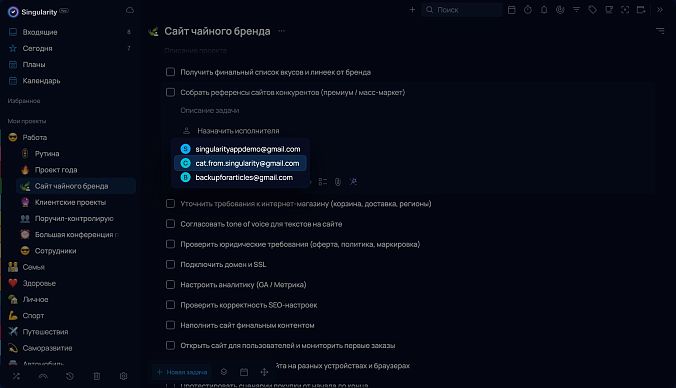 Также в Сингулярити доступна командная работа над проектами для владельцев Pro-аккаунтов: они могут делиться задачами и отслеживать прогресс по их выполнению. Ещё одна фишка — возможность поделиться списком задач из проекта вообще с кем угодно, даже если у пользователя нет аккаунта SingularityApp. Это удобно для составления виш-листов, списков покупок и других целей.