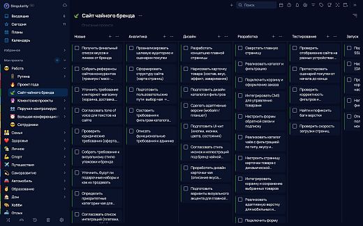 В проектах можно включить отображение задач в виде канбан-доски, а в десктопной версии — переключиться на диаграмму Ганта, чтобы видеть сроки и зависимости задач. Канбан доступен не только в проектах, но и в разделе «Сегодня», что помогает быстро расставить приоритеты и наглядно планировать день. Эти инструменты делают работу над проектами более прозрачной и структурированной, позволяя командам эффективно координировать свои действия.