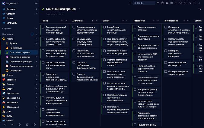 В SingularityApp есть мгновенный поиск по странице — открывается с помощью сочетаний клавиш Ctrl+F (Cmd+F для Mac). Но если нужно искать всюду, пригодится иконка поиска на верхней панели справа — такой поиск найдёт задачи, проекты, секции и даже теги. Единственное — поиск не подсказывает варианты, как это делает Todoist. Но мощный функционал фильтрации поможет, если задачу найти нужно, а точную формулировку ты забыл.