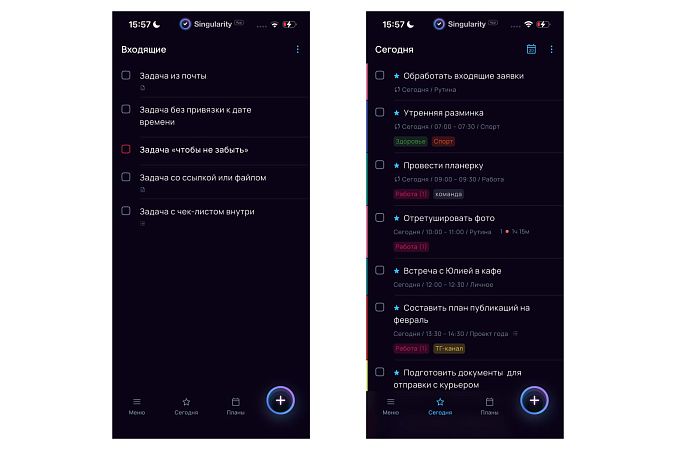 Функционал обоих приложений в мобильной версии максимально повторяет десктопный: те же элементы, та же логика (за редким исключением: например, в мобильной версии SingularityApp не видны задачи подпроектов в родительском проекте, а в мобильной версии Todoist — можно сразу назначать родительский проект, чего нет на десктопе). Оба приложения приятные по дизайну и понятные в интерфейсе — смотри сам:
