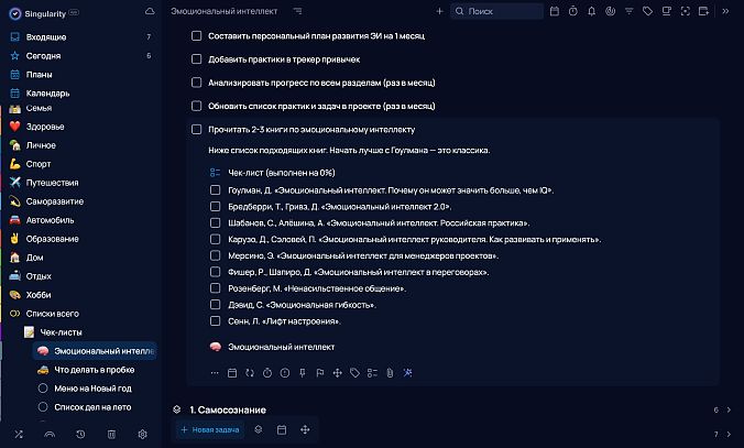 И конечно, в SingularityApp тоже можно добавлять внутри проектов секции, чтобы упорядочивать задачи логически. Если секция разрастётся и станет похожа на подпроект, её легко в него превратить — достаточно кликнуть правой кнопкой и выбрать «конвертировать в проект».
