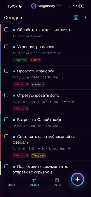 SingularityApp — более гибкий и многоуровневый планировщик, который пригодится тем, кто любит порядок везде и во всём. И для этого у него в рукаве несколько козырей: распечатки планов дня, которые можно легко отсканировать, таймер Помодоро для продуктивности, режим фокуса для сосредоточенности и режим проверки для полного контроля над всем, что есть внутри.