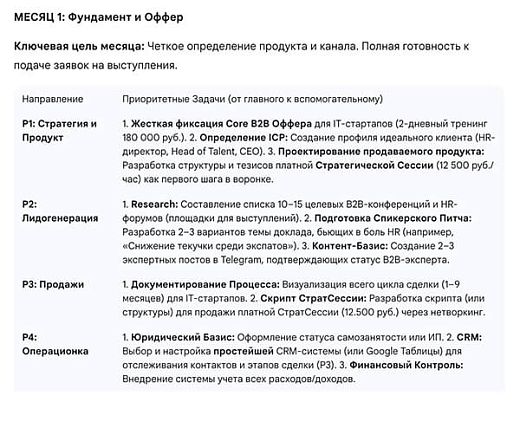 — Стратегия: [Фокус на B2B-модели; развитие личного бренда и привлечение лидов через экспертизу/спикерство].