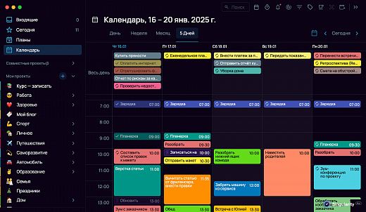 Распределите все дела по проектам, например, работа, личные дела, командировка или дача. Выберите для каждого свой цвет, и все его дела в календаре будут выделены этим цветом.