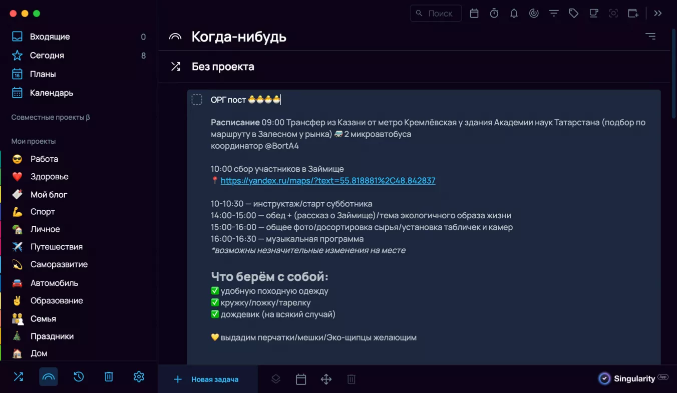 Заметки в Сингулярити — это почти то же самое, что задачи, но без возможности отметить их выполненными. Внутри заметки — полноценный текстовый редактор, как и внутри задачи. Просто запишите все свои мысли в заметке, чтобы не забыть. Например, в заметках можно записывать фильмы, которые хочется посмотреть, адреса и телефоны близких, или сохранять полезные ссылки.