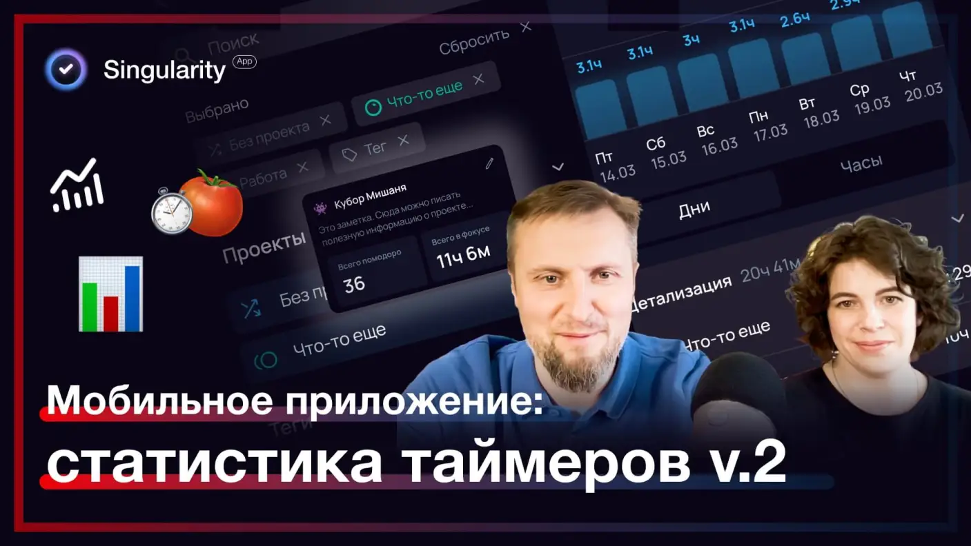 📱 В мобильном приложении SingularityApp обновилась статистика таймеров! Теперь можно выбрать любой период, посмотреть, как распределялось время по часам, и отфильтровать результаты по проектам и тегам 🔍