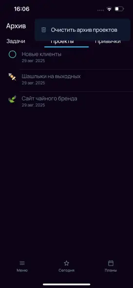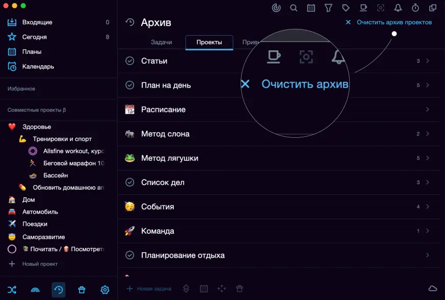 Чтобы вернуть проект из архива, просто перетащите его обратно в список проектов или воспользуйтесь контекстным меню. Он вернется на свое прежнее место.