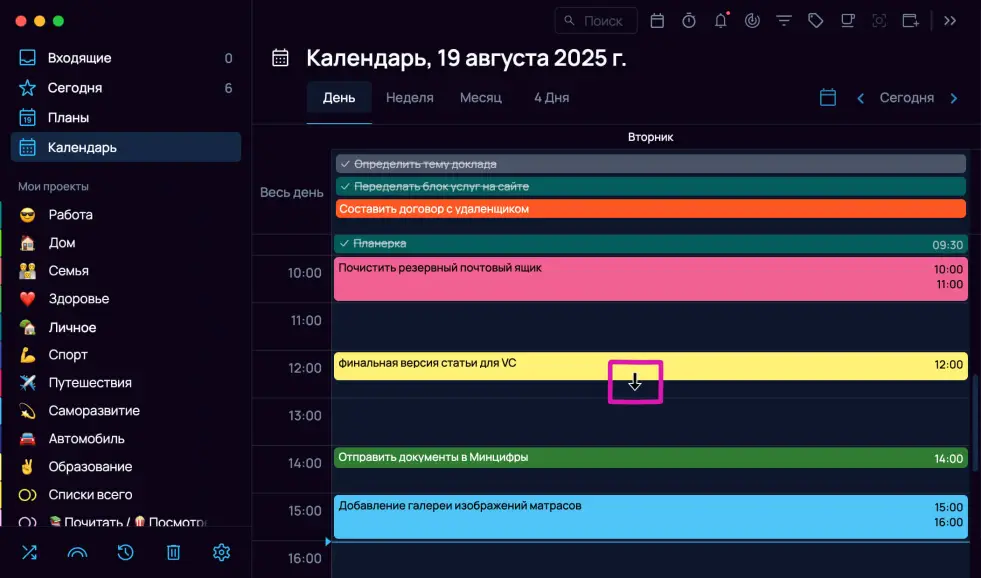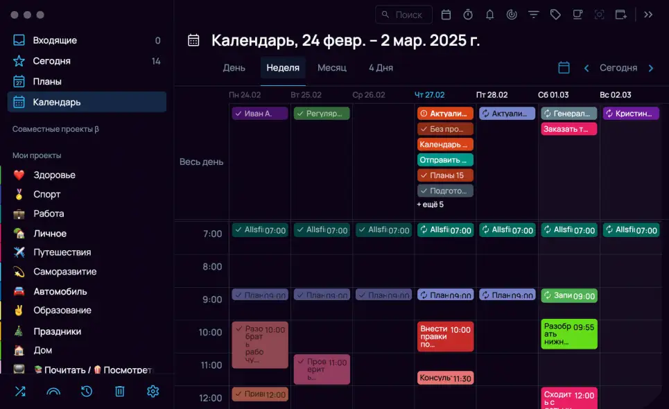 - Неделя: Отображает всю неделю в виде колонок для каждого дня. Задачи без времени также находятся в блоке «Весь день».