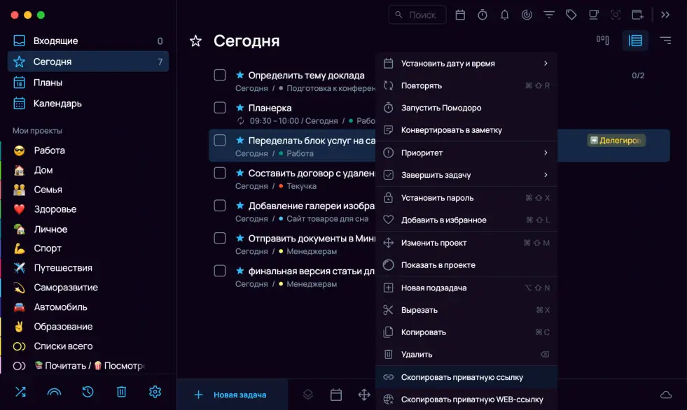 Вы можете выделить любой фрагмент текста в названии или заметке задачи и скопировать его с помощью горячих клавиш ⌘ Cmd / Ctrl + C или через контекстное меню.