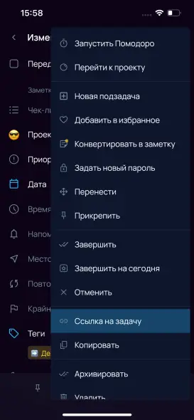 - Ссылка будет скопирована в буфер обмена. При клике на нее SingularityApp откроется именно на этой задаче или проекте.
