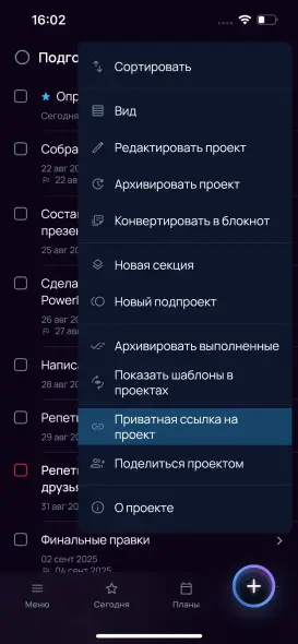 - В появившемся списке выберите «Приватная ссылка на проект». Ссылка будет скопирована в буфер обмена.