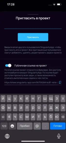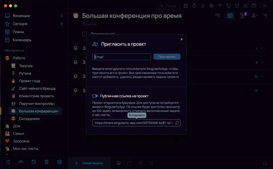 Идеальный способ, чтобы поделиться списком дел с кем угодно, даже если у человека нет аккаунта в SingularityApp. Публичная ссылка на проект откроется в браузере, по ссылке можно посмотреть задачи проекта и даже отметить их выполненными.