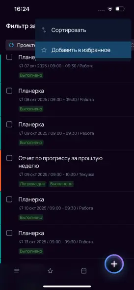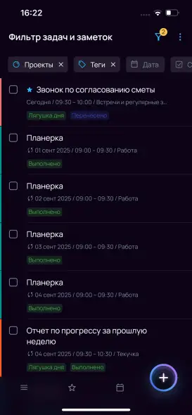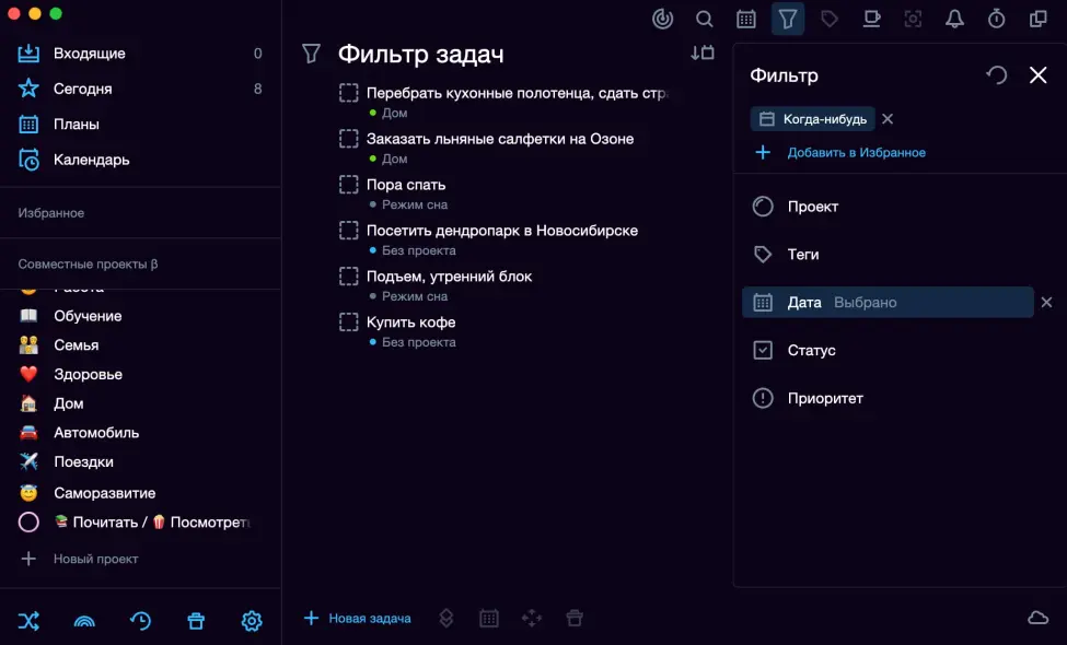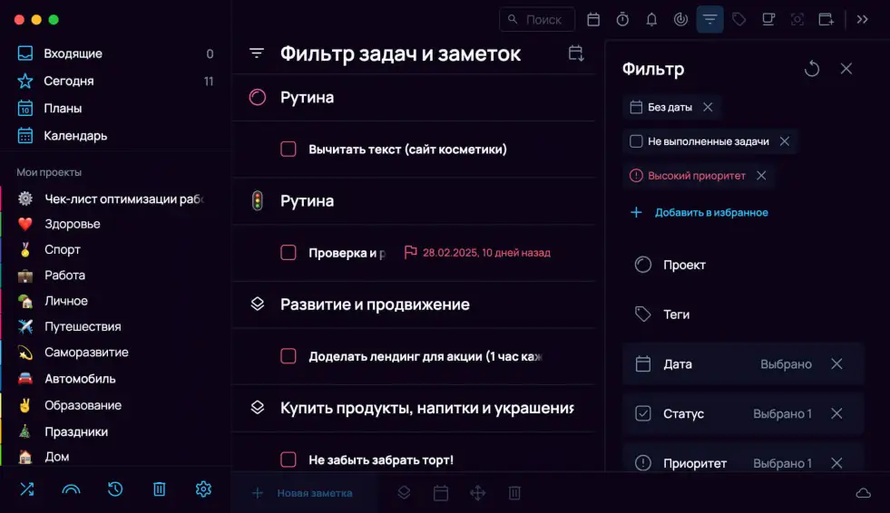Фильтры — это мощный инструмент для организации и поиска задач. С их помощью вы можете отобразить списки дел по конкретным проектам, тегам, датам, статусам или приоритетам, а также создавать и сохранять сложные комбинации для часто используемых запросов.