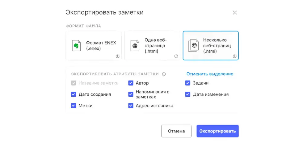 Эта функция доступна в десктопных версиях приложения (Windows, macOS, Linux). Процесс переноса имеет ряд ограничений, так как не все данные при экспорте Evernote передает в файл экспорта.