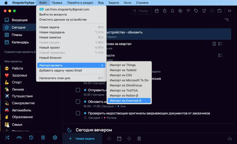 Вы можете перенести свои заметки из Evernote в блокнот SingularityApp. Для этого сначала нужно экспортировать данные из Evernote, а затем импортировать их в SingularityApp.