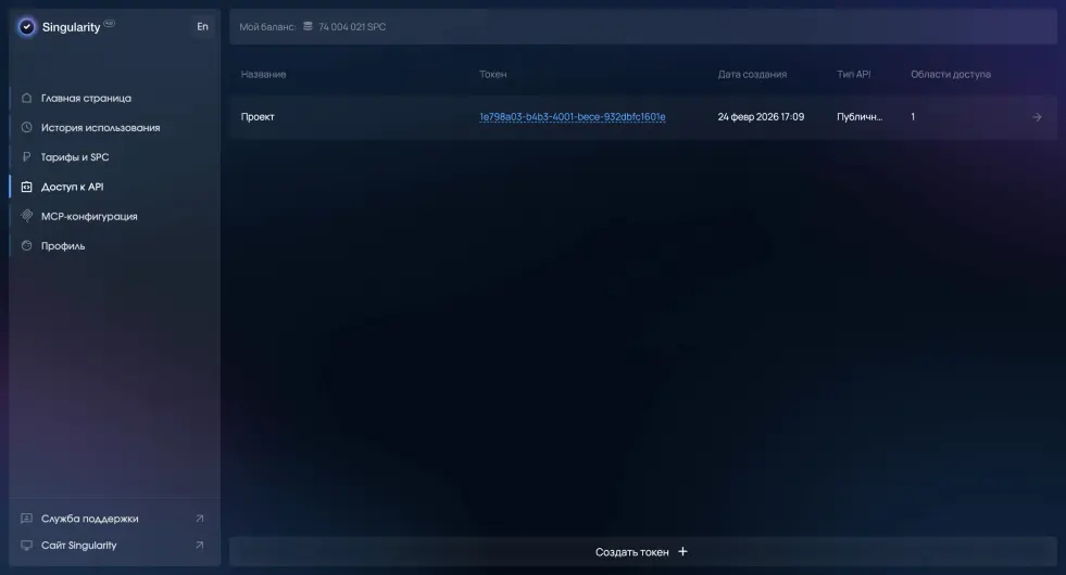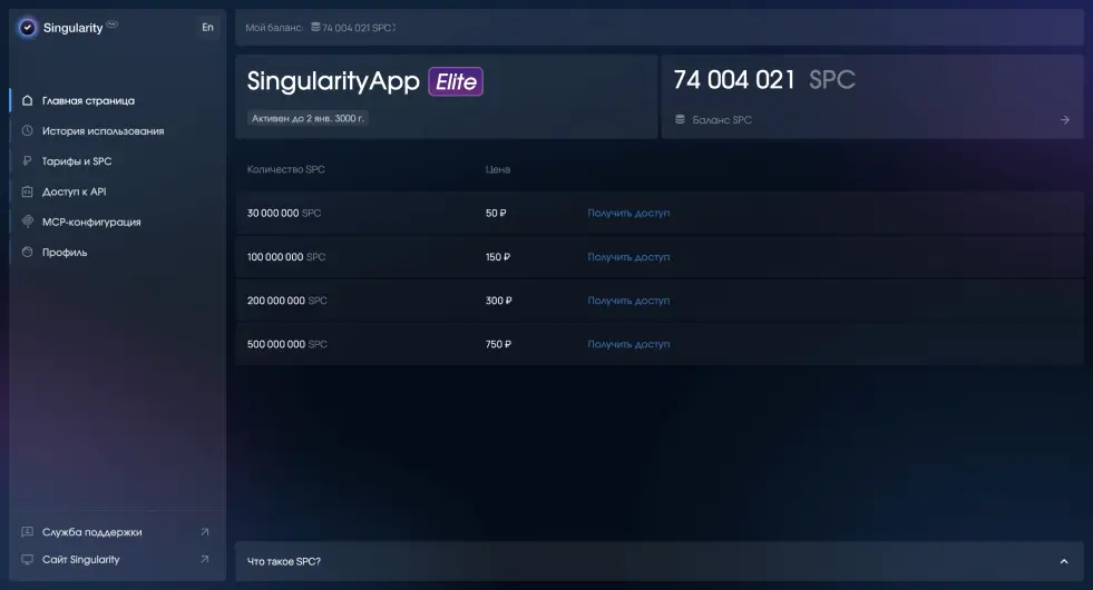 Личный кабинет — это веб-панель для управления вашим аккаунтом SingularityApp. Здесь вы можете пополнять баланс SPC и отслеживать расходы, управлять подпиской, настраивать токены для API и MCP, а также редактировать данные профиля.