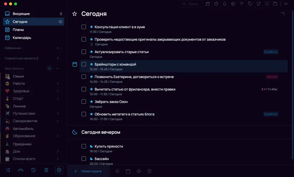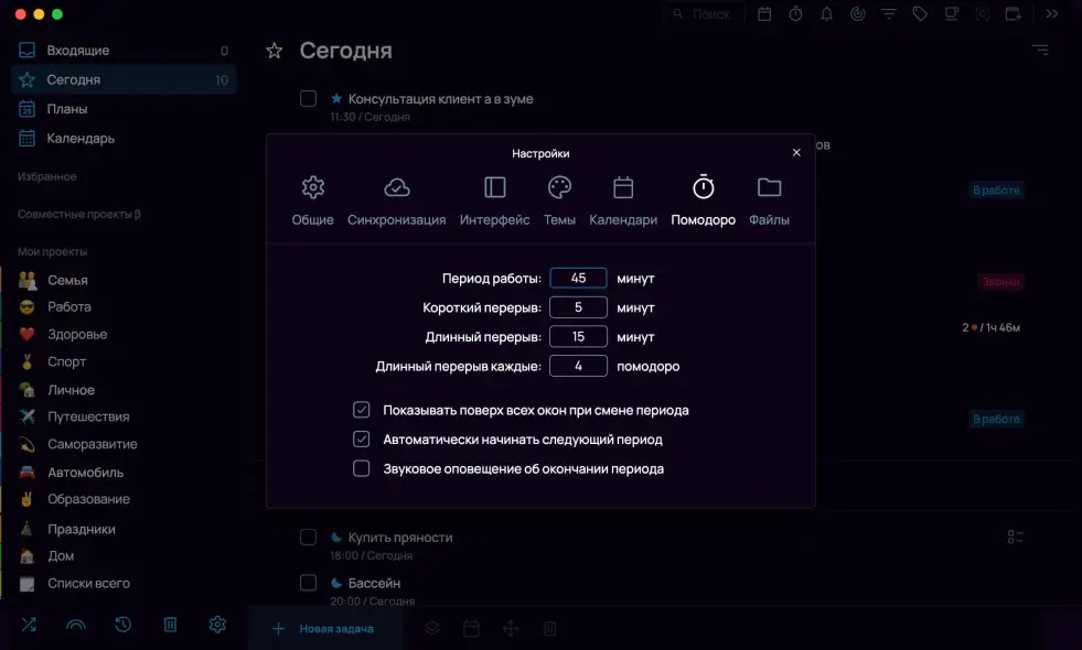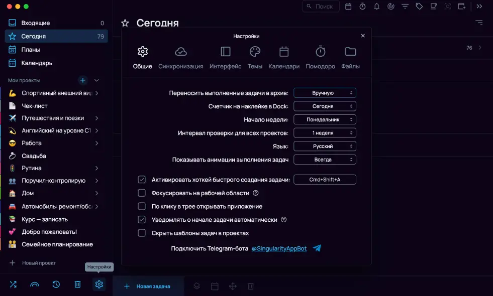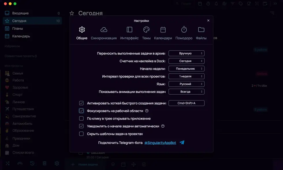Здесь же можно активировать хоткей для быстрого создания задачи, подключить Telegram-бота, включить фокусировку на рабочей области, настроить поведение значка в трее, включить автоматическое добавление уведомлений о начале задачи для задач с установленным временем и скрыть шаблоны задач в проектах.