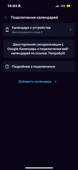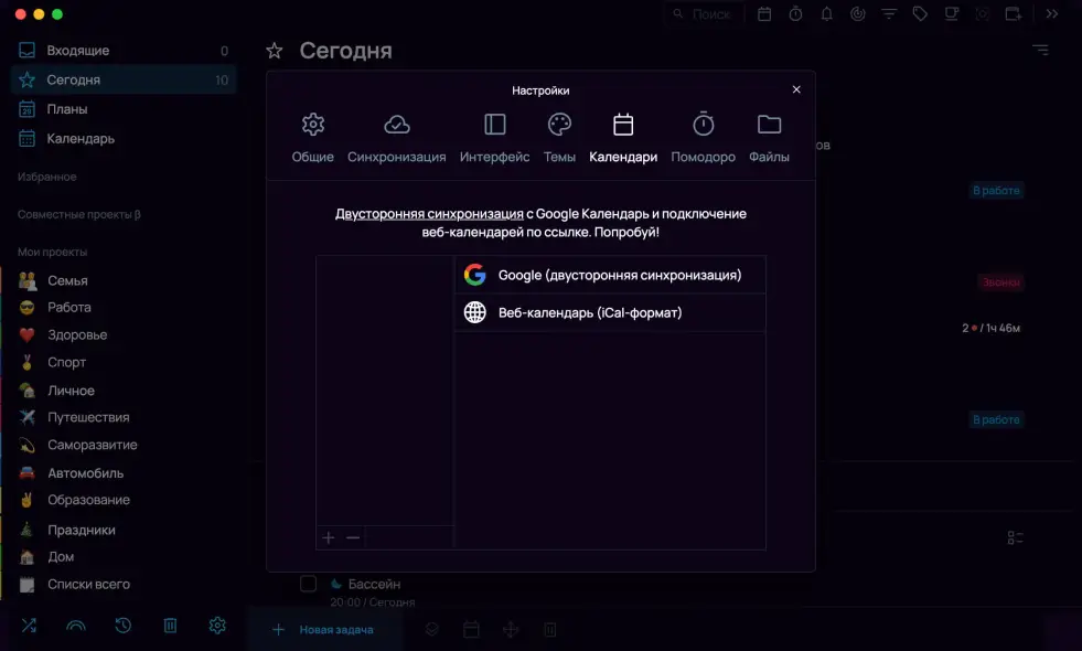 Во вкладке Календари можно подключить Google, Yandex, Outlook и другие веб-календари в режиме просмотра. А также настроить двустороннюю синхронизацию с Google Calendar.
