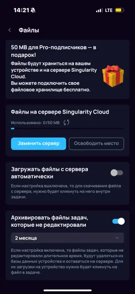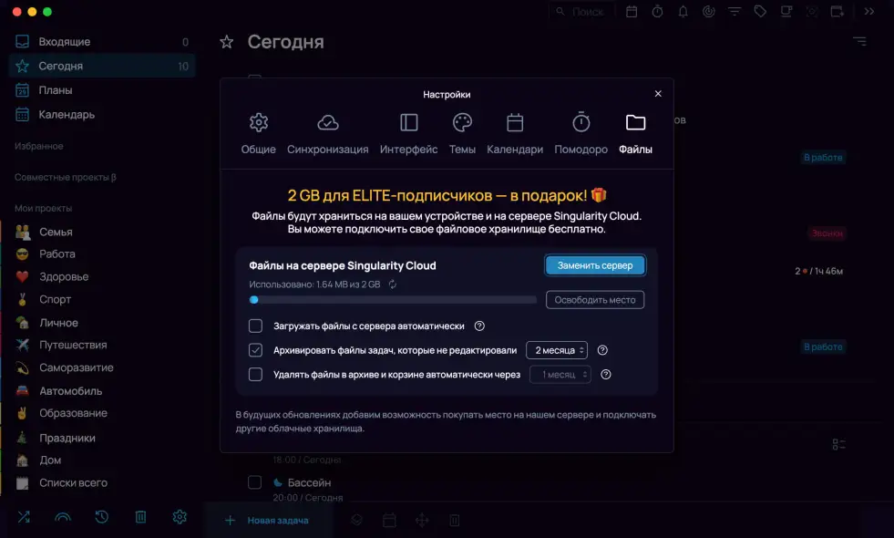 Во вкладке Синхронизация можно создать аккаунт в Singularity Cloud и активировать синхронизацию, чтобы работать с проектами и задачами на разных устройствах.