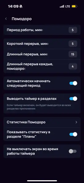 Во вкладке Помодоро можно настроить таймер обратного отсчета: задать для него интервалы и отрегулировать его положение относительно остальных окон.