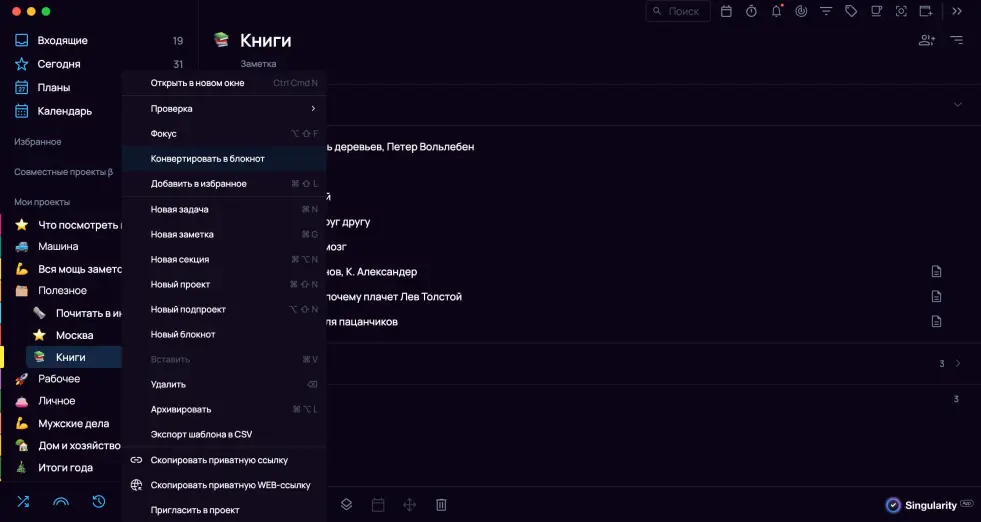 - Чтобы конвертировать существующий проект в блокнот, откройте меню проекта и выберите Конвертировать в блокнот.