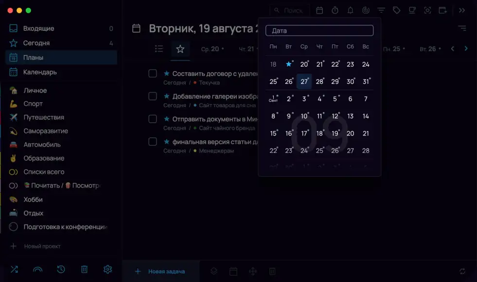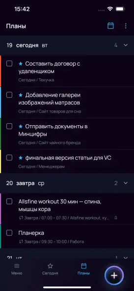 Раздел «Планы» помогает вам увидеть все задачи с установленными датами и организовать их по дням, неделям и месяцам. В этом разделе есть два основных режима отображения: общий вид по секциям и просмотр по дням в отдельных вкладках.