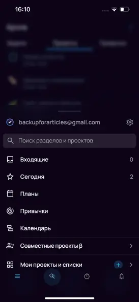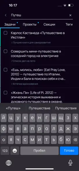 Поиск по всей базе данных приложения — ищет совпадения по названиям задач, проектов, секций, тегов, а также по содержимому заметок и пунктам чек-листов.