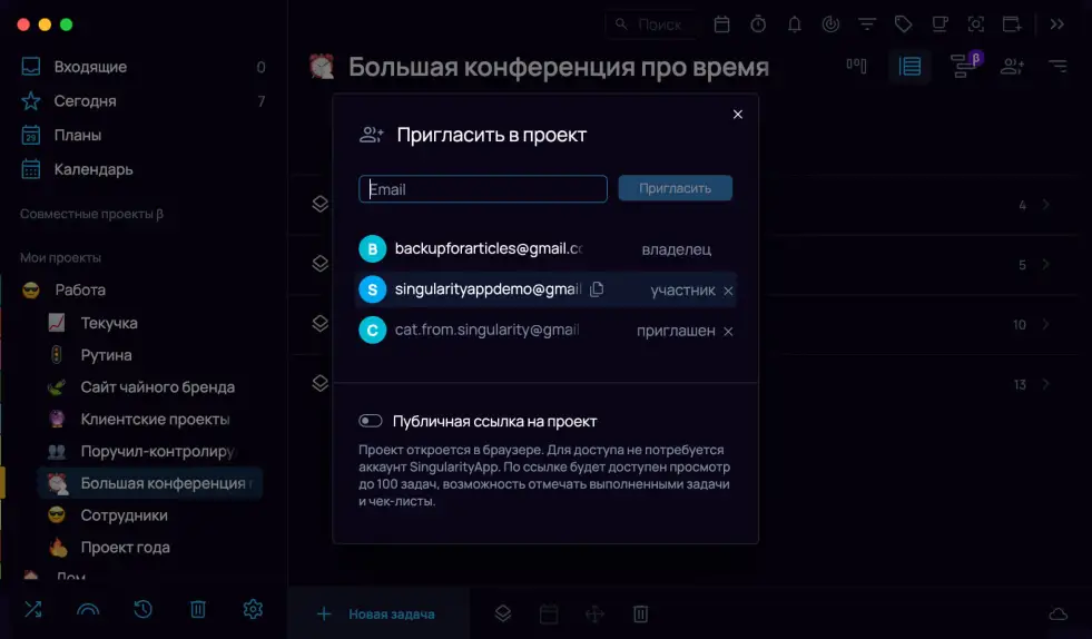 При совместной работе над проектом возможности по работе с проектом и его задачами отличаются для владельца и приглашенных участников. Этот справочник поможет разобраться в правах доступа и других важных деталях.