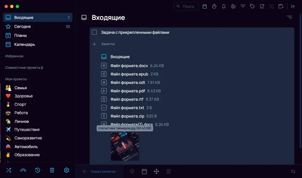 Этот способ идеально подходит, когда файл является основным документом или ресурсом для задачи/заметки (например, договор, счет, техническое задание). Файл прикрепляется в специальное поле под текстовым редактором.