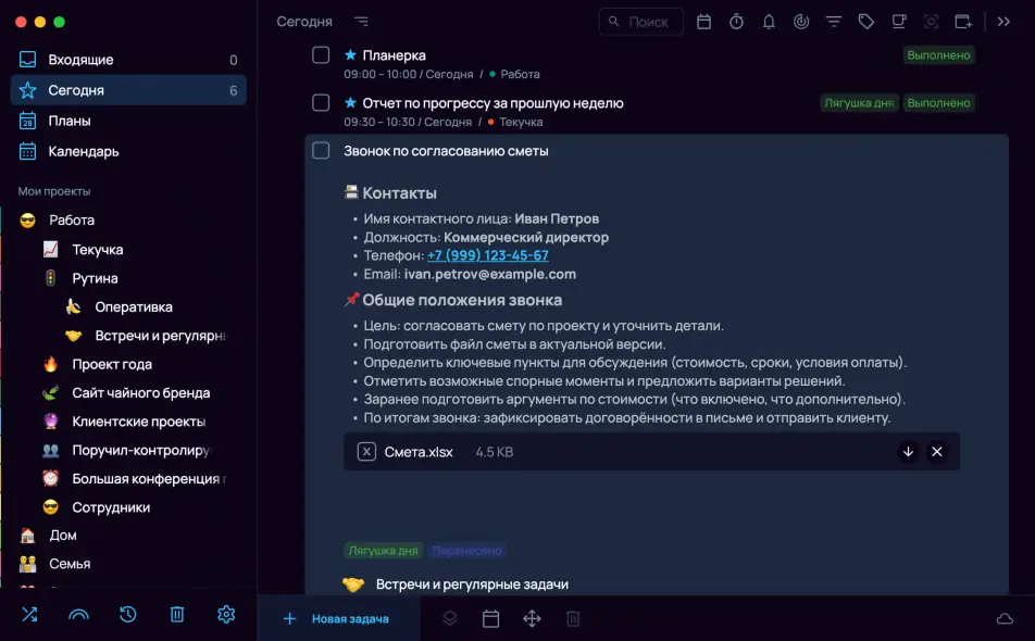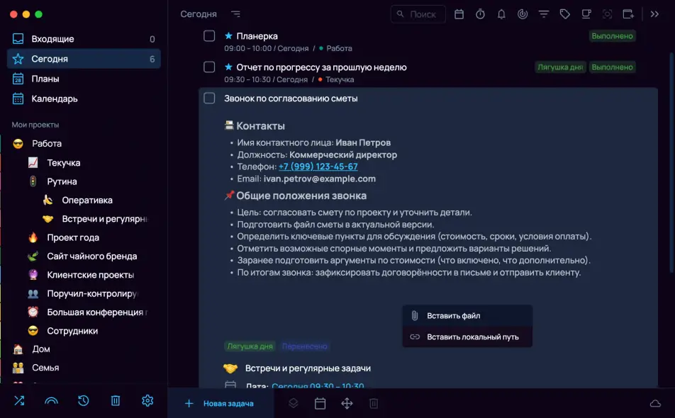 Повторяющиеся задачи: Файл можно прикрепить к шаблону задачи, чтобы он был доступен при создании задачи на основе этого шаблона. К отдельному повтору задачи можно добавить файл только к заметке внутри этого повтора.