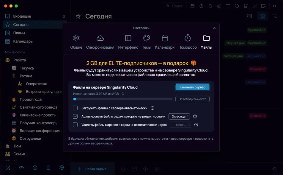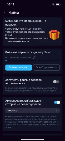 Архивировать старые файлы (экономия места на устройстве): Включите эту опцию, чтобы файлы из задач, которые вы давно не редактировали, автоматически удалялись с устройства, но оставались на сервере. Вы сможете скачать их снова в любой момент.