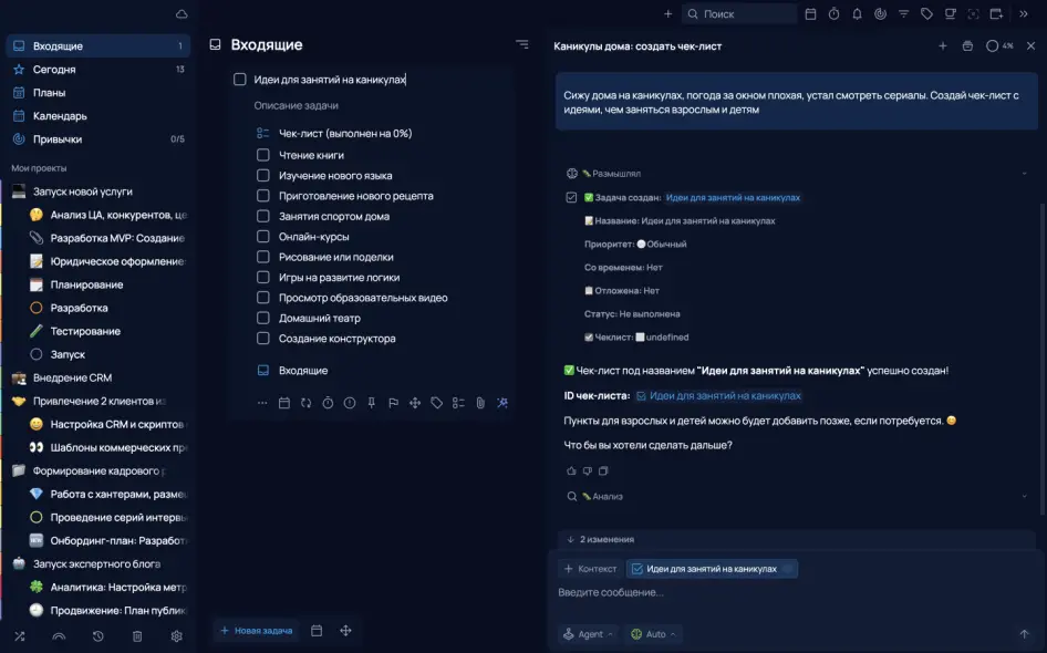 Режим Agent — это полнофункциональный режим для работы с вашими данными. Здесь ассистент не просто отвечает на вопросы, а активно работает с вашими задачами, проектами и привычками — создает, редактирует, удаляет, ищет и анализирует. Вместо того чтобы вручную выполнять действия в приложении, вы просто пишите запрос, и ассистент берет работу на себя.