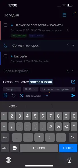 В мобильной версии SingularityApp вы можете не тратить время на ручную установку даты и времени. Просто укажите их в названии задачи при создании (голосом или текстом), и приложение автоматически распознает и установит нужные параметры.